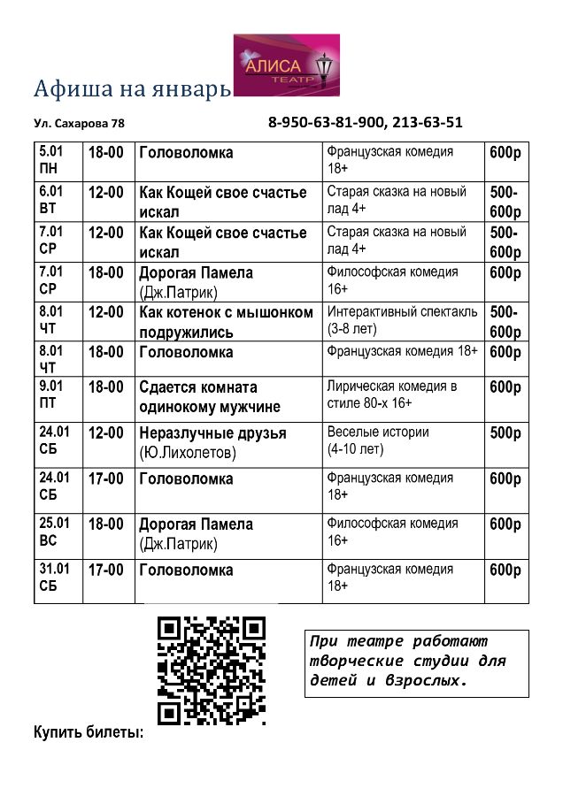 Приглашаем на спектакли! Январь 2026г